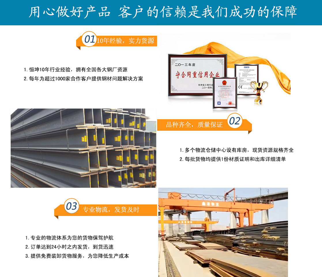 蘭州恒坤商貿有限公司立足于鋼材貿易,主要經營:鋼板、角鋼、工字鋼、槽鋼、H型鋼、鍍鋅槽鋼、鍍鋅角鋼、鍍鋅板、鍍鋅卷、鍍鋅圓鋼、鍍鋅工字鋼多種型號鋼材產品。多年來,我公司始終堅持質量第一,信譽至上的經營方針,與酒鋼、包鋼、八鋼、唐鋼、鞍鋼、萊鋼、兗礦、日照鋼鐵、濟鋼,成都、天津等多家企業(yè)達成大批量物資供應協(xié)議,并且與省內外多家客戶建立了合作關系。